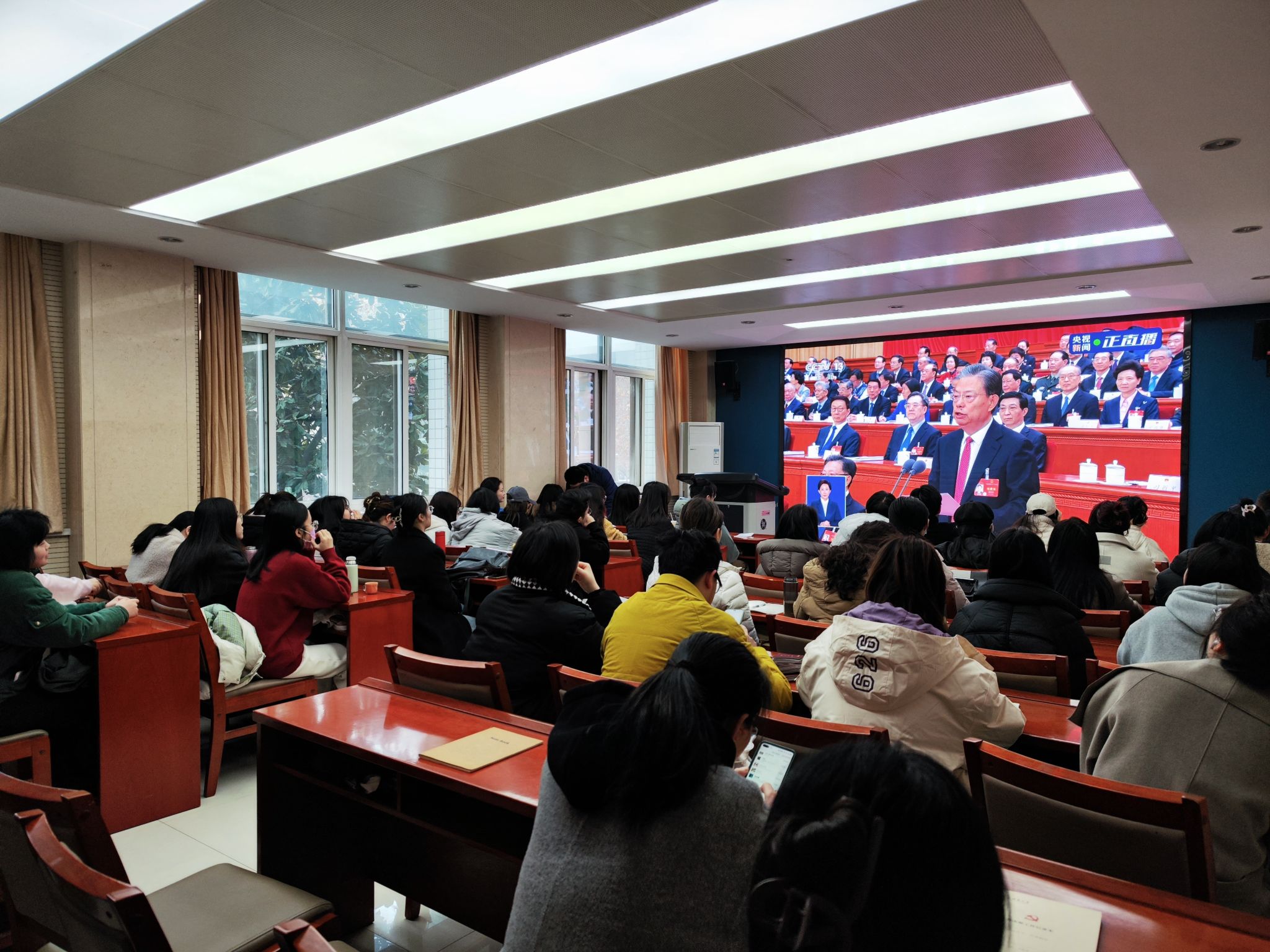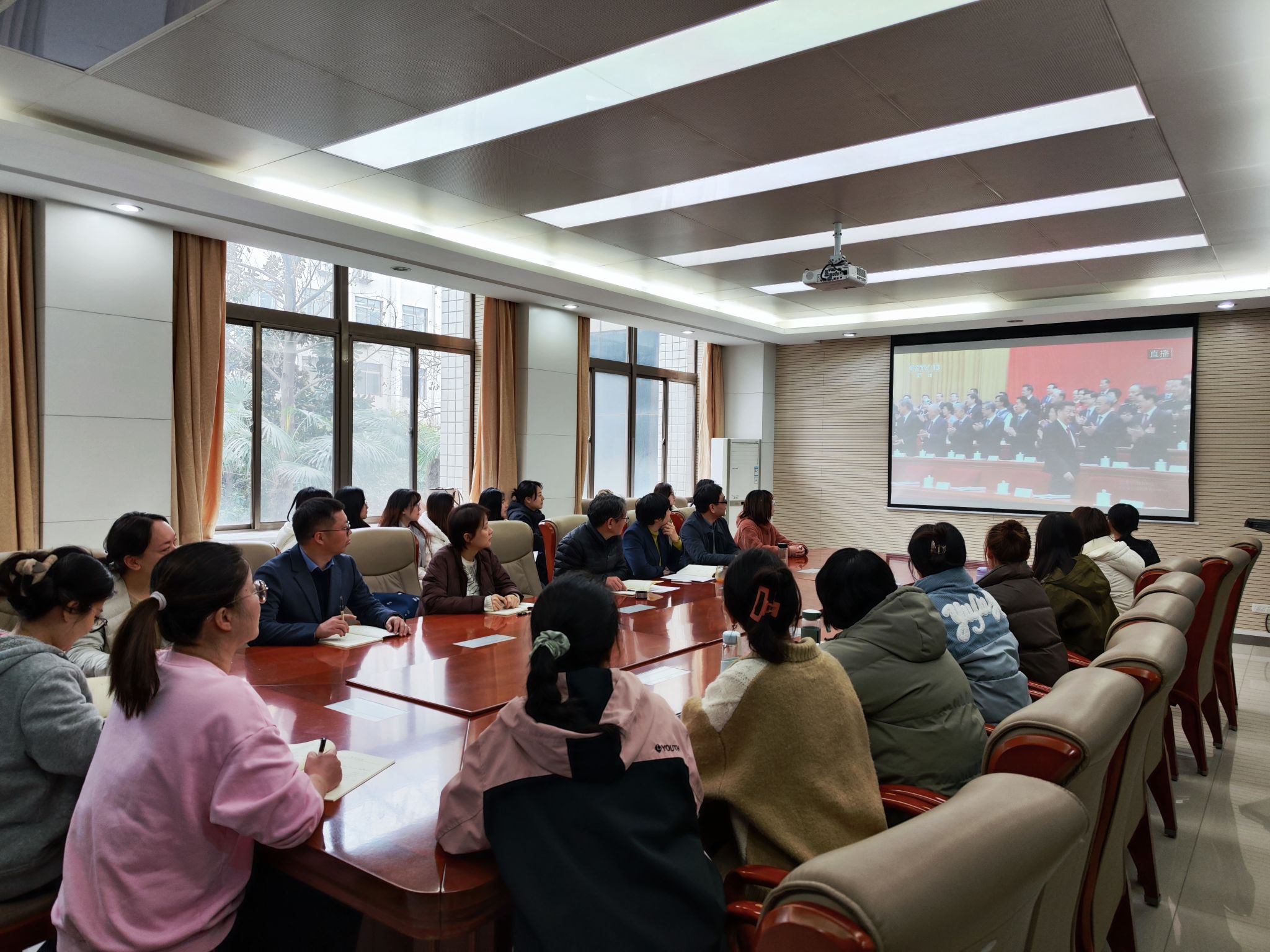 3月5日上午9点,十四届全国人大二次会议开幕会在北京人民大会堂举行,公司党政领导班子及员工党员于教学九楼9209、9217室集中收看直播,深入领会会议精神,积极分享学习心得。