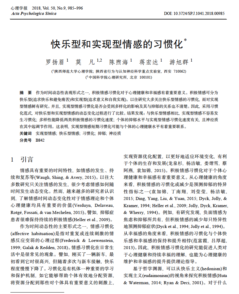 简介:幸福通常转瞬即逝。例如,昨天新买的车今天再看时已不能激起内心的波澜。那怎样的生活才能带来更为持续的幸福体验?为了解决这个科学问题,该成果从时间动态的视角,比较了以追求快乐为核心特征的快乐型情感(如享受一顿美餐等)和以追求意义为核心特征的实现型情感(如挑战自我和帮助他人等)在多次重复之后的短时间动态变化,并研究了它们短时间内的动态变化与长时间跨度的心理健康的关系。通过两个子研究,该成果主要发现,以追求意义为核心特征的实现型情感比以追求快乐为核心特征的快乐型情感在时间上更能持续,并且这种短时间的可持续性与人们长时间的抑郁程度有关联。该成果在《心理学报》发表后,被中国人民大学复印报刊资料的《心理学》期刊于2019年第1期全文转载,被中外文文献引用18次(截至2023/1/16),获2021年陕西高等公司人文社会科学研究优秀成果奖二等奖。